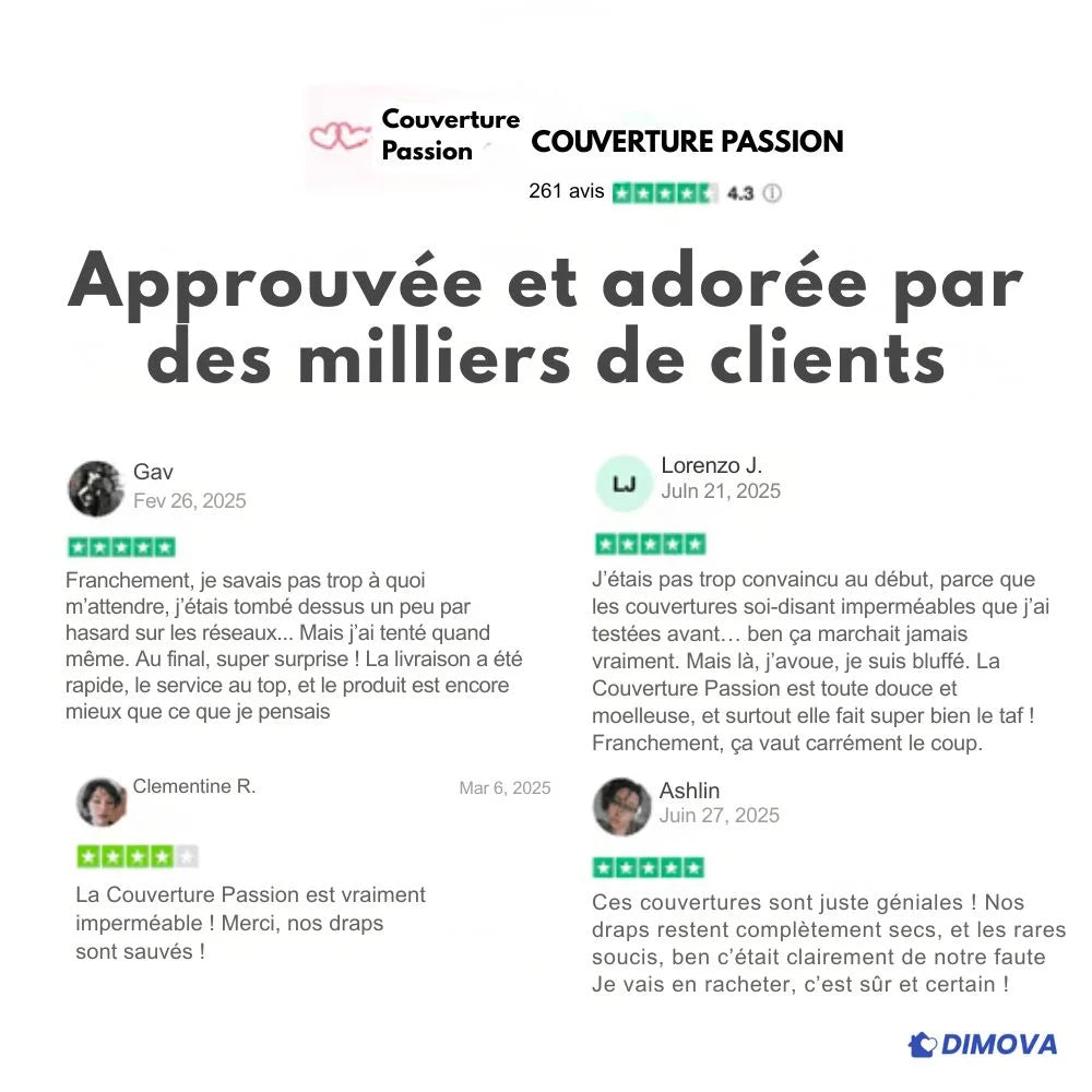 On avait déjà testé une “couverture imperméable” achetée sur Amazon… résultat : les draps trempés. Mais là, la Couverture Passion tient vraiment ses promesses ! Plus aucune galère, c’est devenu un indispensable.