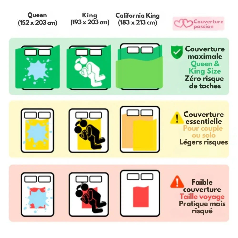 Mais si tu veux être tranquille pendant les moments chauds, choisis la taille XL pour couvrir tout le lit et éviter les débordements sur les draps 😉